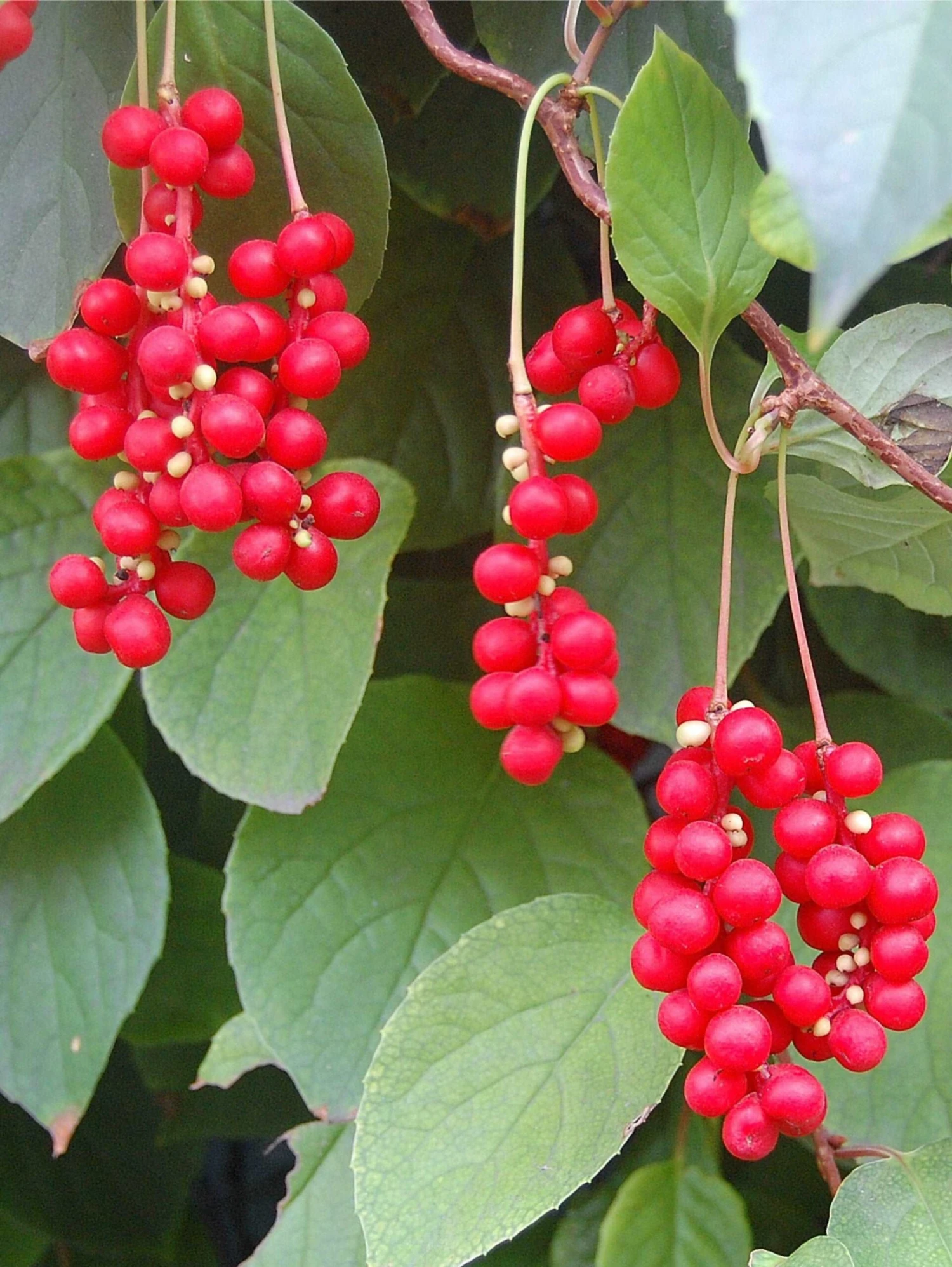 This lovely shrubby fruiting vine comes to us from the mountains of China and the Russian far east. It does well in moist, shady places where few fruit plants thrive but it will also grow in full sun in mild summer areas, or morning sun and afternoon shade in hotter locations. It produces large clusters of round red fruit, and the leaves have a lemon scent. The fruit is acidic and very aromatic, and it is dried and used in medicinal teas. Or, sweetened, the fruits are used to make a juice or preserves that is said to be stimulating and energy restoring.